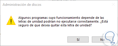 Allí pulsamos en el botón Si y podremos ver el siguiente mensaje.Nuevamente pulsamos en el botón Sí para ejecutar la acción y podremos ver que dicha partición ha sido oculta del explorador de archivos de Windows. Esto ocultará la partición del explorador, pero podremos seguir accediendo a ella desde el Administrador de discos.