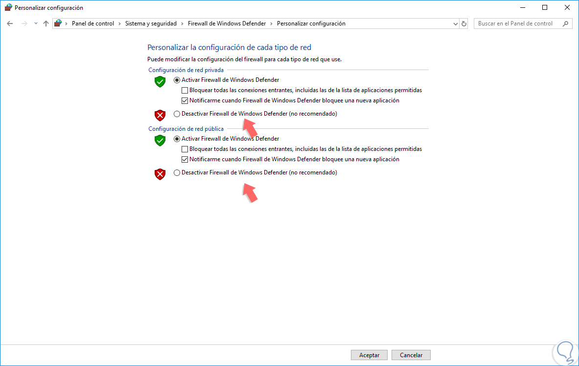 Allí activamos las casillas “Desactivar Firewall de Windows Defender” e intentamos acceder al sitio web para su validación.