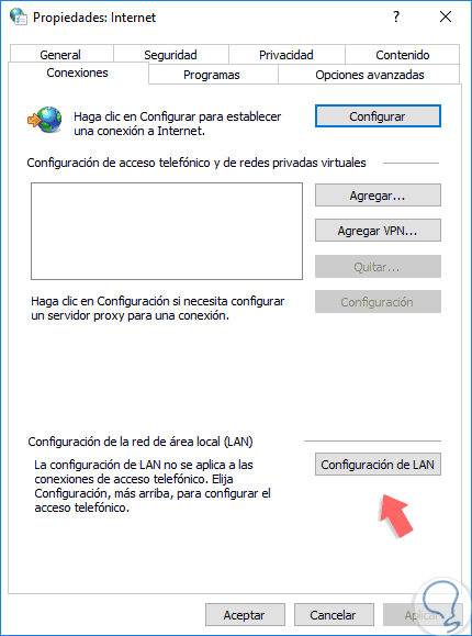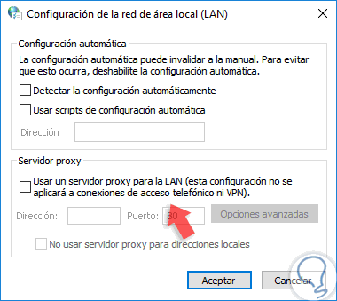 Allí pulsamos en el botón “Configuración de LAN” y en la nueva ventana emergente comprobamos que la casilla “Usar un servidor proxy para LAN” ubicada en la sección “Servidor proxy” se encuentre deshabilitada. Pulsamos en Aceptar para aplicar los cambios.