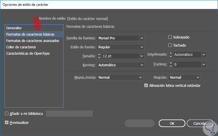 En la ventana nueva que aparece seleccionamos la opción de “Formatos de caracteres básicos”. Desde aquí podemos modificar los atributos de la fuente y después pulsar en Ok para guardar los cambios. Ahora cada vez que crees un nuevo documento o abras de nuevo el programa ese perfil se creará con las modificaciones realizadas. Recuerda que puedes modificar todos los que quieras.