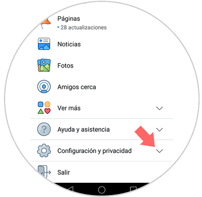 Lo primero que debes hacer es entrar dentro de la App, y desplegar en el menú de la parte superior derecha y seleccionar la opción de "Configuración y privacidad“.