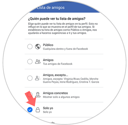 Se desplegará una lista con más opciones disponibles. En este caso, si no quieres que nadie vea tu lista de amigos, debes elegir “Solo yo”.