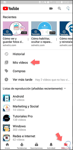 Abrimos la aplicación de YouTube desde Android y entramos en la opción de “Biblioteca – Mis vídeos”.