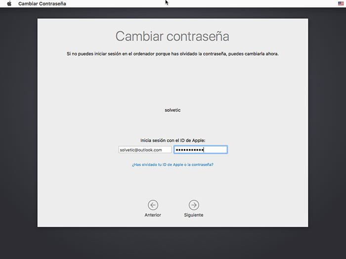 Allí tendremos la opción de recuperar la contraseña usando el AppleID o la clave de recuperación creada por FileVault, en base a la opción seleccionada veremos lo siguiente: