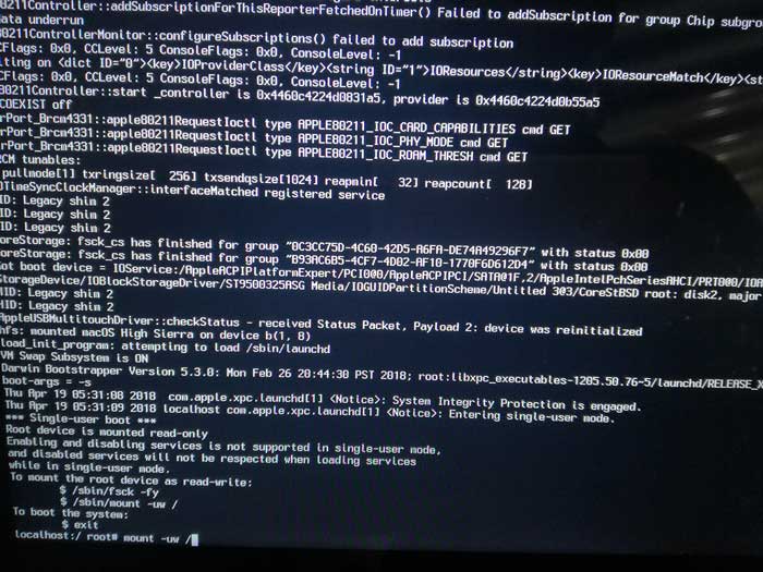 Este es otro de los métodos que nos ofrece macOS para restablecer la contraseña del usuario administrador a través de la consola, para ello, reiniciamos o encendemos el equipo pulsando la combinación de teclas Comando + S y en la ventana que será desplegada ejecutamos la siguiente línea: