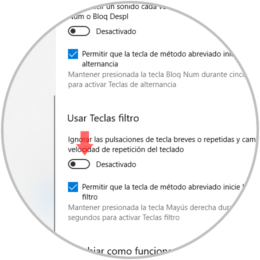 Allí damos clic en la categoría “Accesibilidad” y en la nueva ventana iremos a la sección “Teclado” y allí desactivamos, si está activo, el interruptor de la línea “Teclas de filtro”: