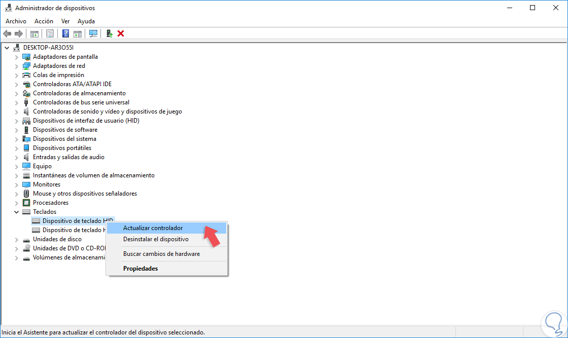Para actualizar los controladores de nuestro teclado podemos esperar que Windows Update busque las nuevas actualizaciones o si deseamos algo mucho más rápido, vamos de nuevo al administrador de dispositivos y allí daremos clic derecho sobre el controlador de teclado y seleccionamos la opción “Actualizar controlador”: