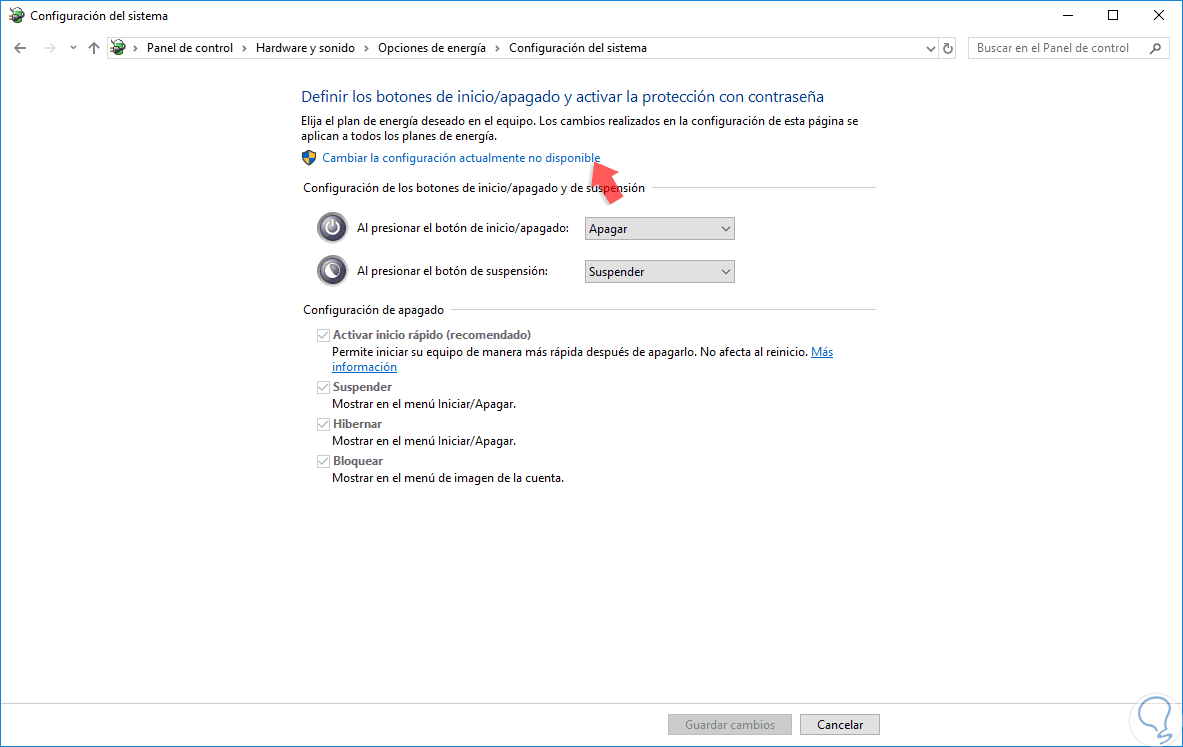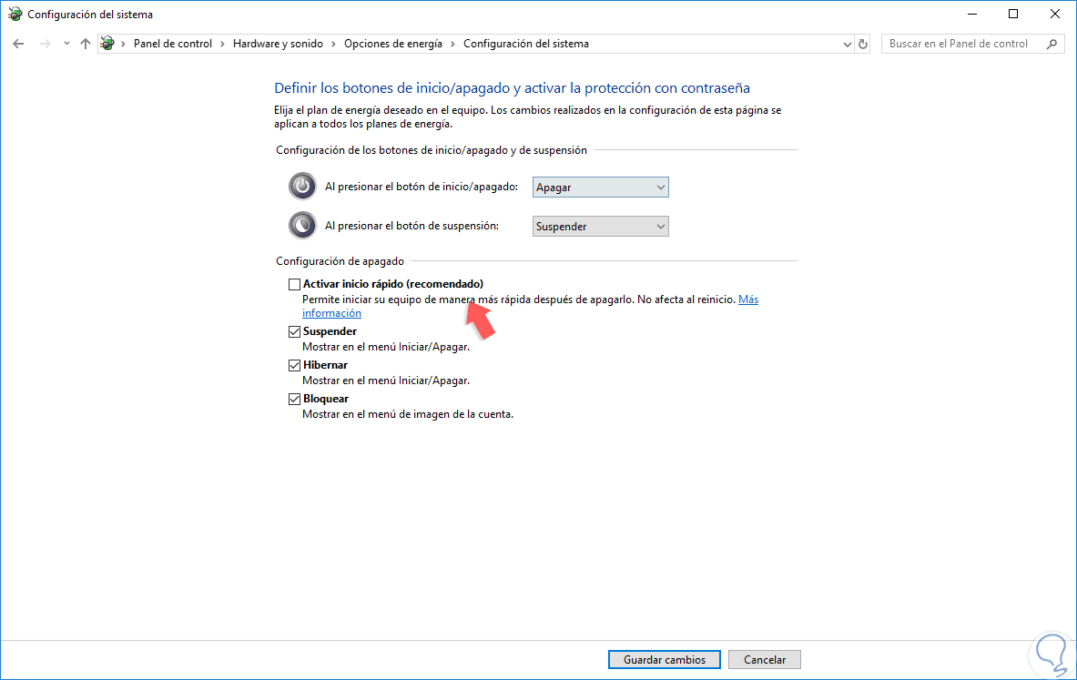 Damos clic en la línea “Cambiar la configuración del plan actualmente no disponible” y procedemos a desactivar la casilla “Activar inicio rápido”. Pulsamos en el botón “Guardar cambios” para finalizar.