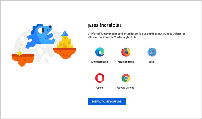 Una vez que accedas a esta URL, podrás comprobar que tu navegador está actualizado. En el caso de que no sea así, deberás actualizarlo. Si todo está bien, podrás continuar seleccionando "Disfruta de YouTube".
