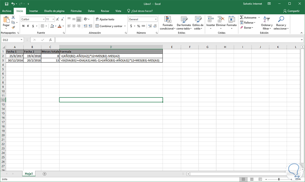 =(AÑO(LDate)-AÑO(EDate))*12+MES(LDate)-MES(EDate)En este caso ejecutaremos lo siguiente: