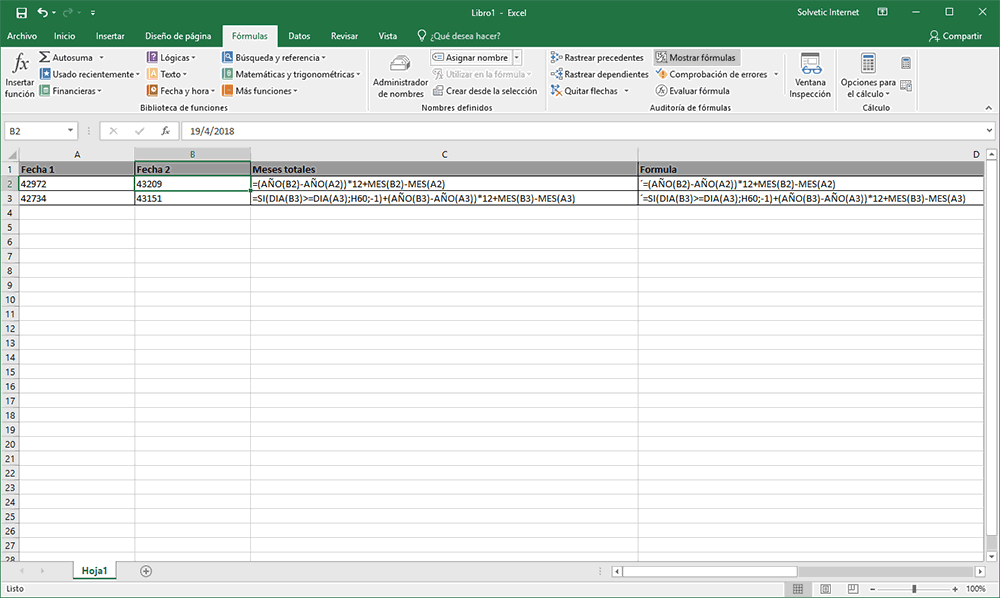 =SI(DÍA(LDate)>=DÍA(EDate),0,-1)+(AÑO(LDate)-AÑO(EDate))*12+MES(LDate)-MES(EDate)En este caso ejecutaremos lo siguiente:
