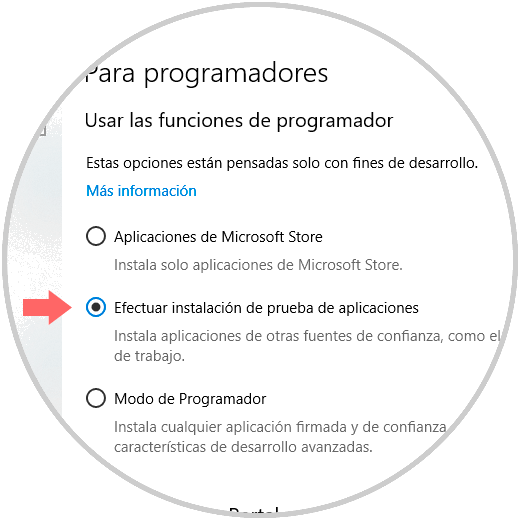 Si la aplicación que vamos a instalar no es de la Tienda de Windows, sino de una fuente confiable podemos recurrir a la opción de aplicaciones en pruebas.Por defecto Windows 10 aprueba solo las aplicaciones universales, es decir, aquellas que se deben instalar desde la Tienda de Windows, pero si esto no es así, sino de una fuente de confianza y de la cual sabemos su origen, podemos activar dicha opción directamente.