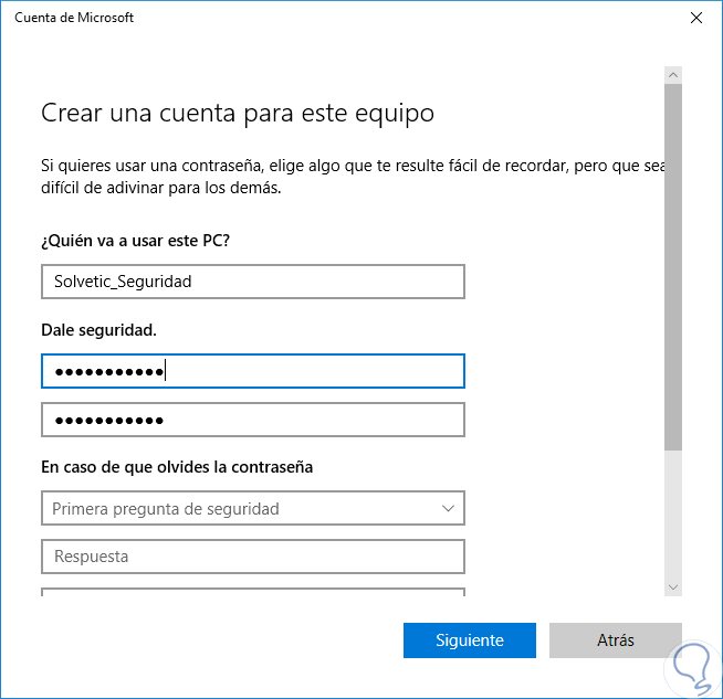 Allí damos clic en la línea “Agregar un usuario sin cuenta Microsoft” y en la siguiente ventana ingresaremos la contraseña y las respectivas preguntas de seguridad: