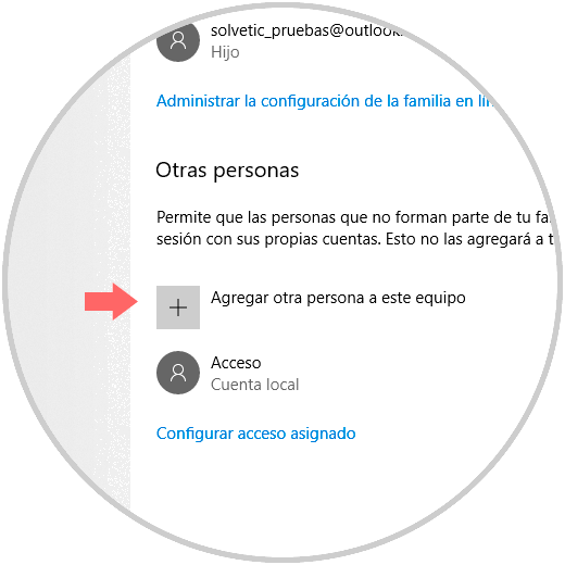 Allí pulsamos en la sección “Cuentas” y en la nueva ventana vamos a la sección “Familia y otras personas” y daremos clic en el botón “Agregar otra persona a este equipo”: