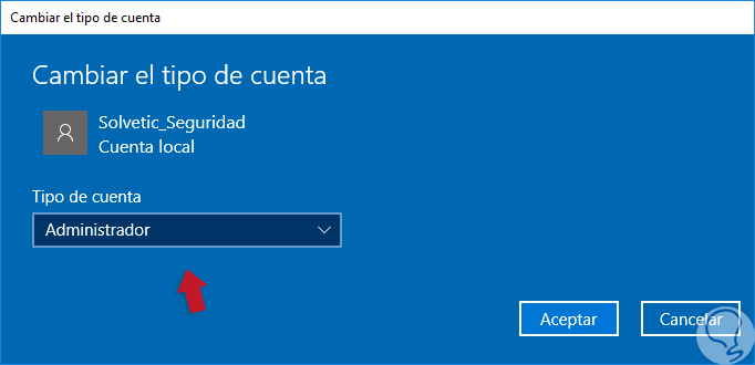 Pulsamos en el botón “Cambiar el tipo de cuenta” y en la ventana desplegada seleccionamos la opción “Administrador” en el campo “Tipo de cuenta”. Pulsamos en el botón Aceptar para guardar los cambios.