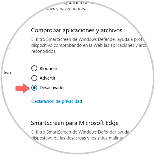 Para ello, iremos al Centro de seguridad de Windows Defender y allí nos dirigimos a la sección “Control de aplicaciones y navegador” y activaremos la casilla “Desactivado” ubicada en la sección “Comprobar aplicaciones y archivos”.