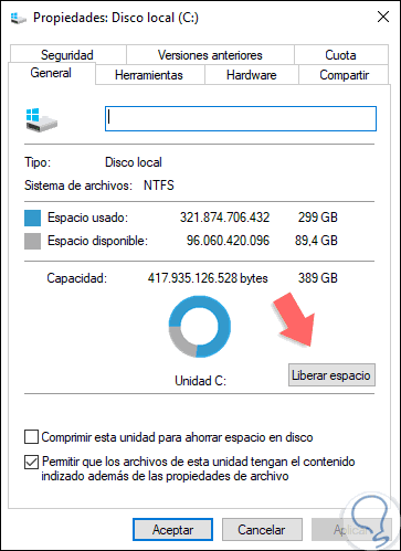 Para eliminar estos archivos, daremos clic derecho sobre la unidad C y seleccionamos “Propiedades” donde veremos lo siguiente: