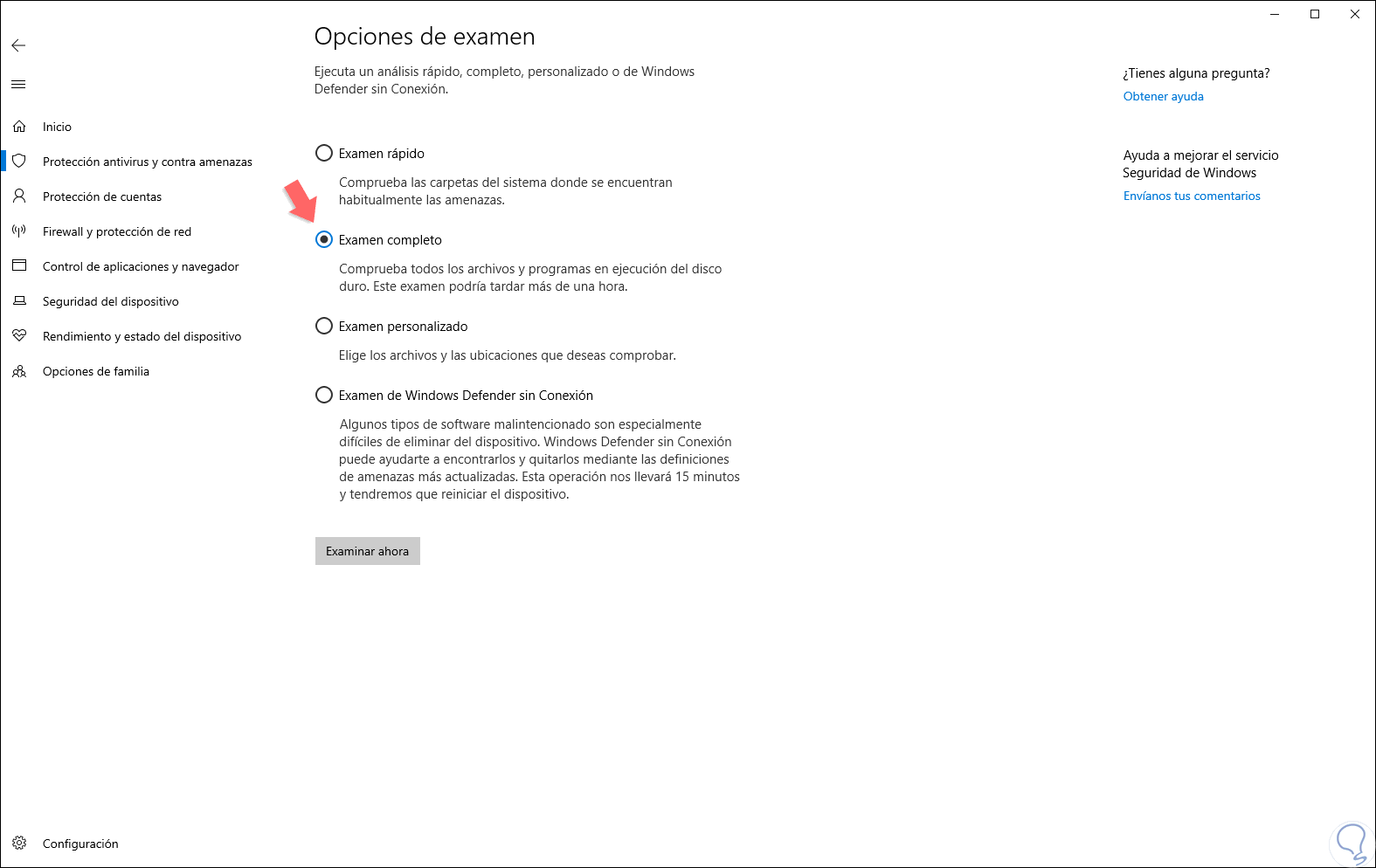 Allí damos clic en la línea “Opciones de examen” y en la nueva ventana activamos la casilla “Examen completo”. Pulsamos en “Examinar ahora” para iniciar el análisis.