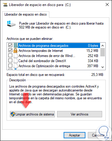Pulsamos en el botón “Liberar espacio” y será desplegado lo siguiente. Allí activaremos las casillas necesarias y también podemos pulsar en el botón “Limpiar archivos del sistema” para una búsqueda más completa, finalmente pulsamos en Aceptar para aplicar el proceso de borrado.
