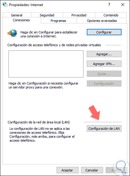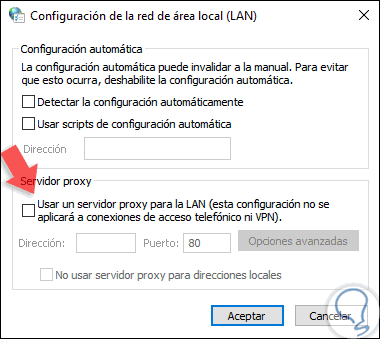 Allí seleccionamos la opción “Configuración de LAN” y en la nueva ventana comprobamos que la casilla “Usar un servidor proxy para la LAN” esté desactivada: