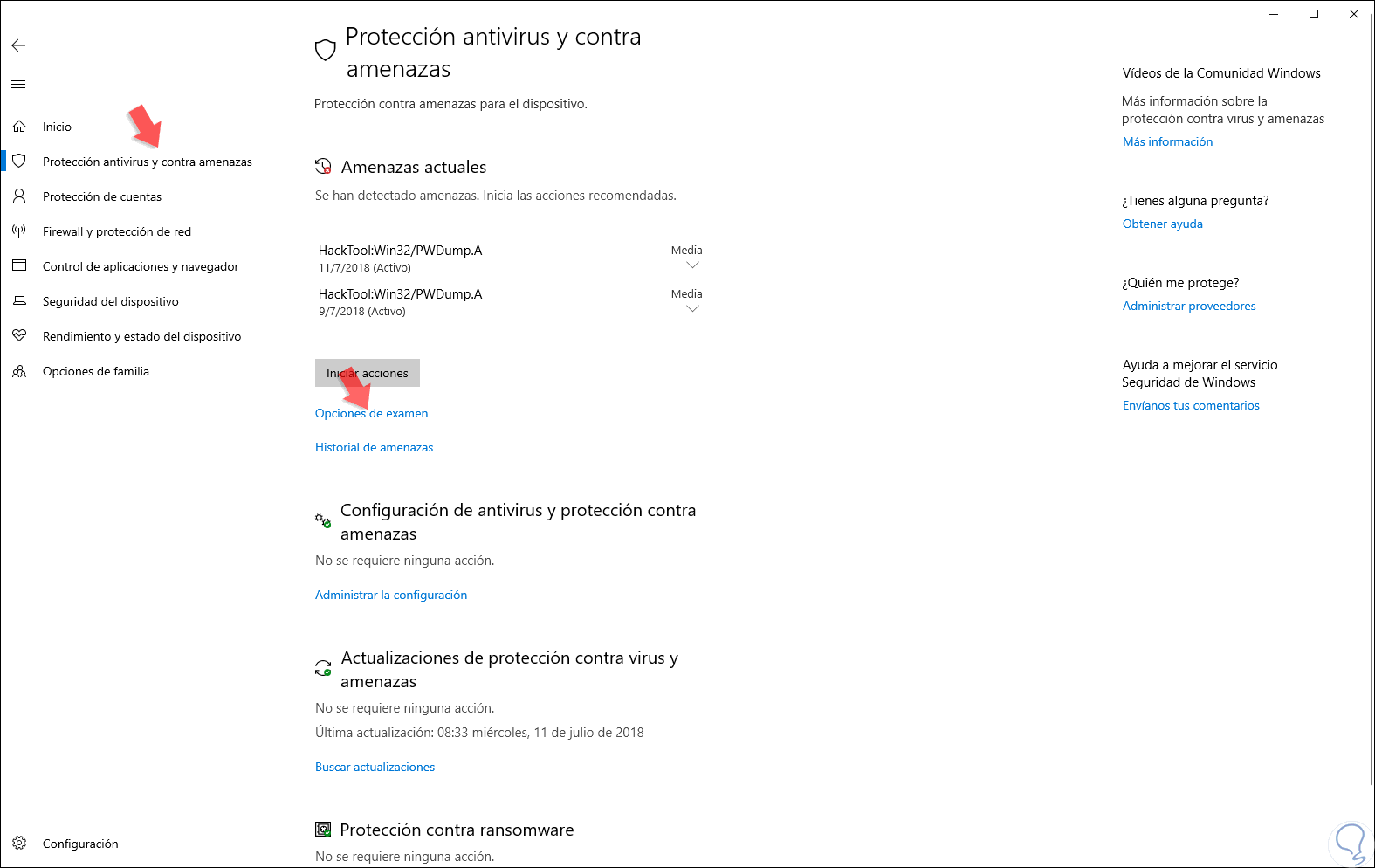 Para ejecutar este análisis iremos a “Seguridad de Windows” y allí vamos a la sección “Protección contra virus y amenazas” donde veremos lo siguiente: