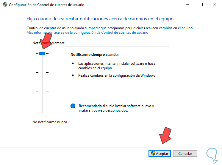 Aquí vamos a elevar el nivel a "Notificarme siempre". Pulsa en "Aceptar" para guardar los cambios.