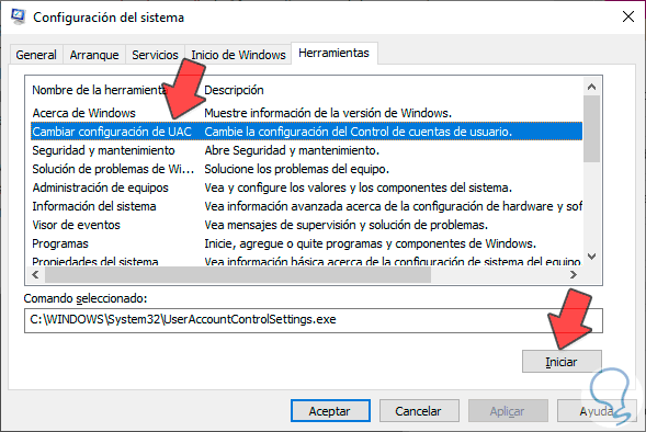 Entramos en el apartado de "Herramientas" , seleccionamos "Cambiar configuración de UAC" y pulsamos en "Iniciar"