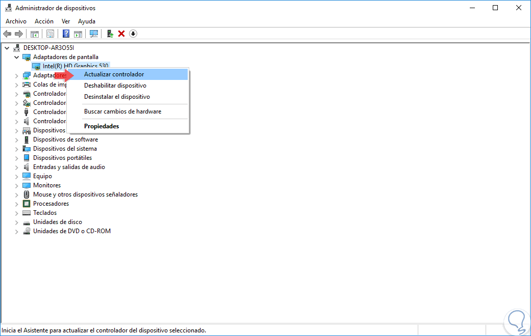 Para realizar esto desde el Administrador de dispositivos, usaremos las teclas Windows + R y ejecutamos el comando “devmgmt.msc” y en la ventana desplegada daremos clic derecho sobre el controlador a actualizar y seleccionamos la opción “Actualizar controlador”: