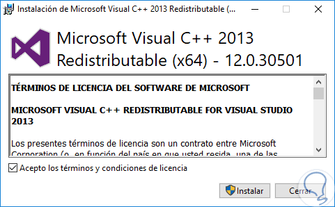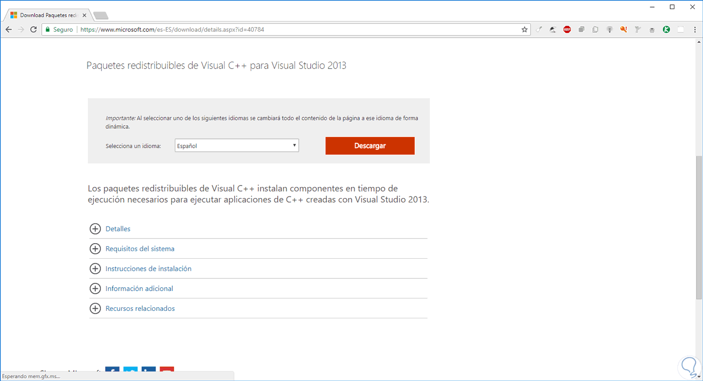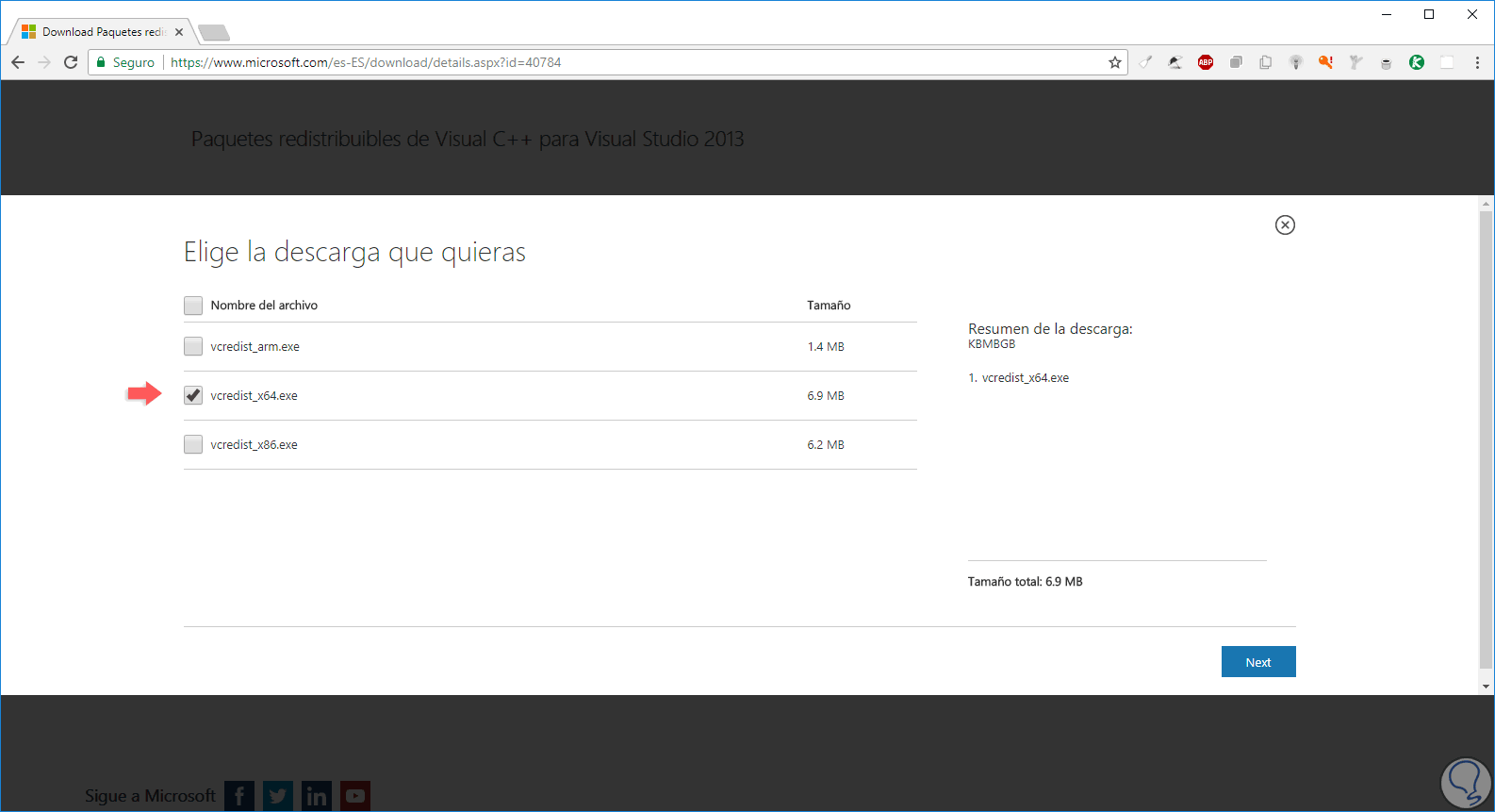 Para ello, vamos al siguiente enlace donde podemos descargar el archivo MSVCR120.dll el cual forma parte de los paquetes redistribuibles de Visual C ++ para Visual Studio 2013: