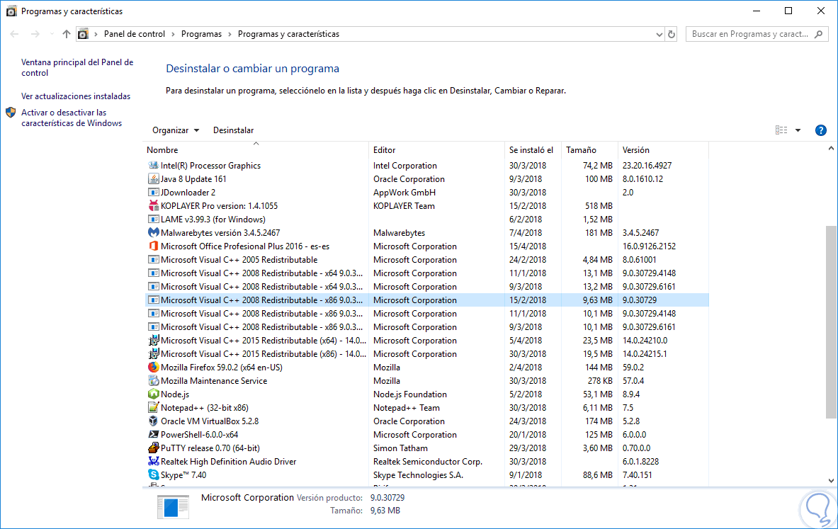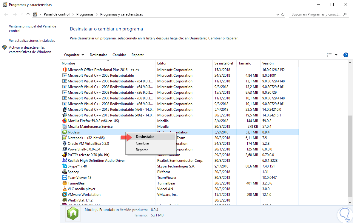 Pulsamos Enter o Aceptar y en la ventana desplegada ubicaremos el programa que genera dicho error, daremos clic derecho sobre él y seleccionamos la opción “Desinstalar”: