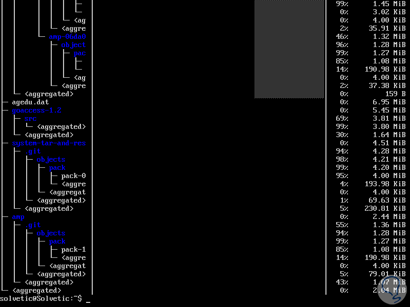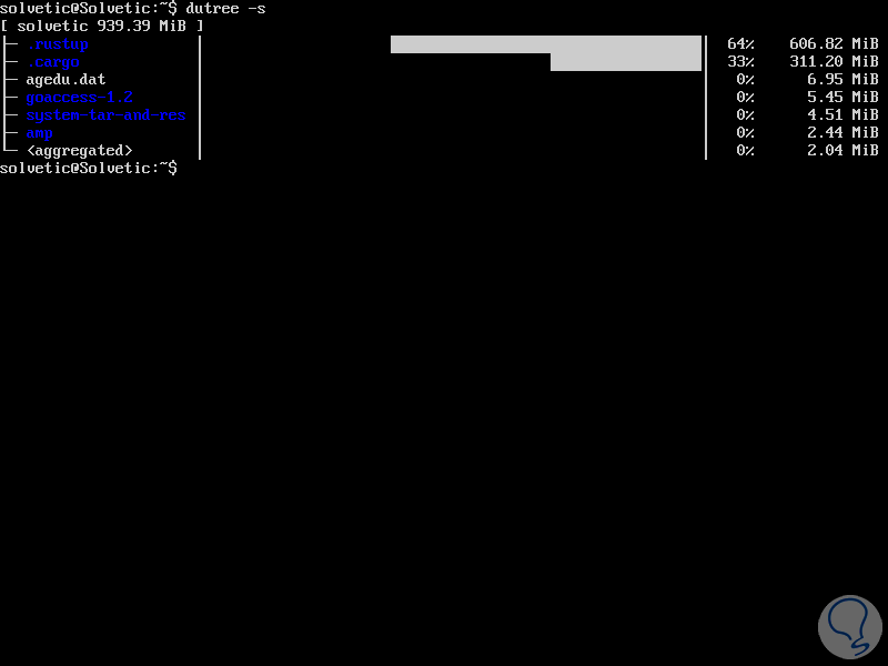 dutree -aComo resultado veremos que todos los archivos inferiores al tamaño establecido por defecto tendrán la leyenda aggregated: