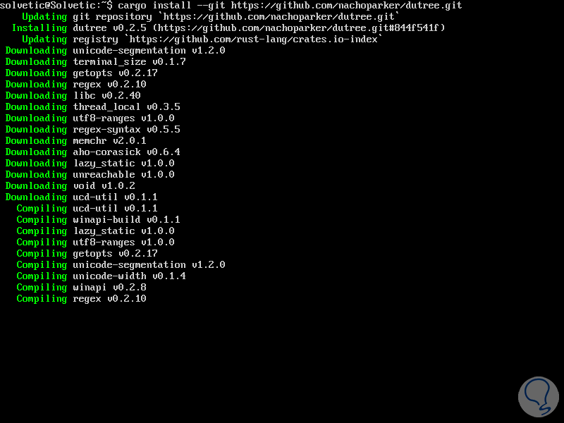 Una vez que se ha instalado el lenguaje Rust en el sistema, sera posible ejecutar el siguiente comando para instalar strong> dutree en las distribuciones de Linux de la siguiente manera: