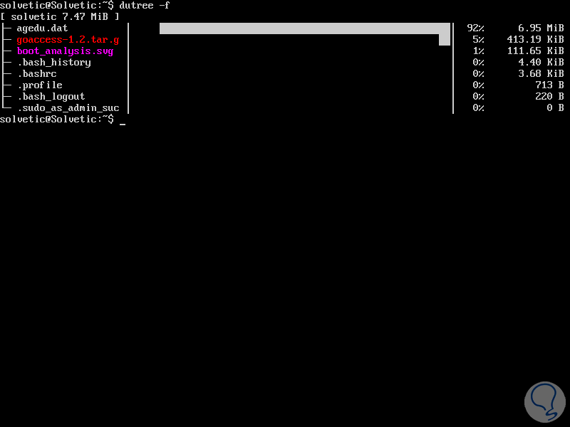 Con Dutree será posible obtener una visión general local rápida omitiendo directorios, haciendo uso de la opción -f así: