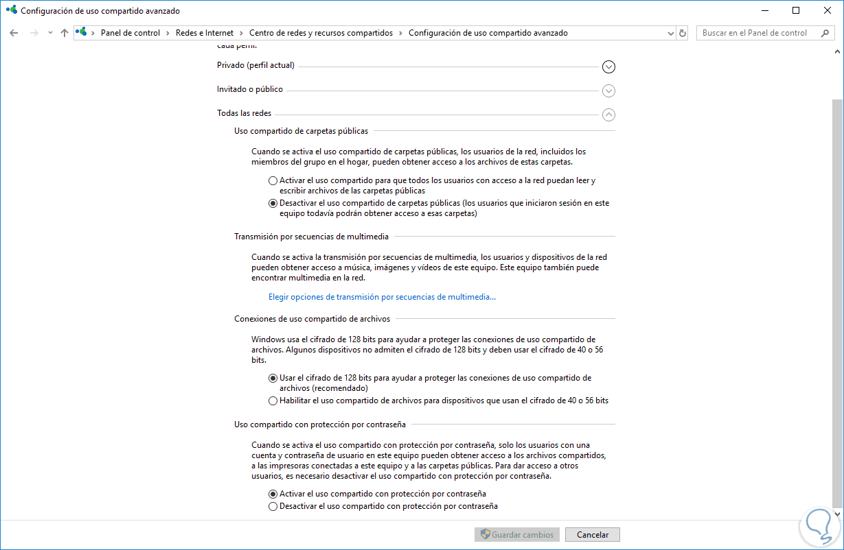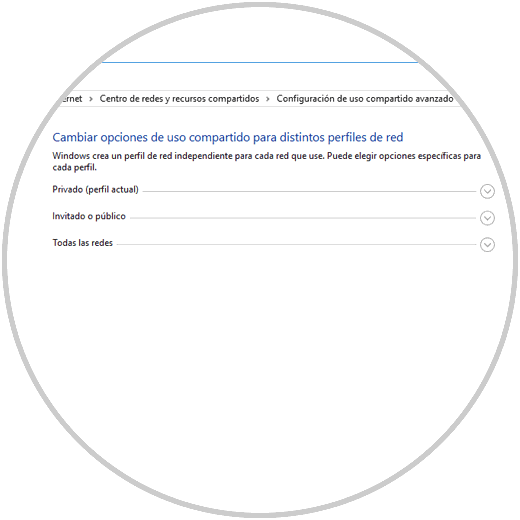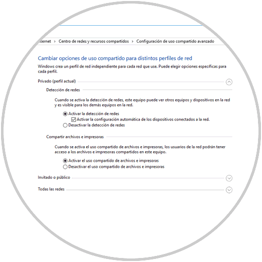 Allí debemos tener en cuenta que solo es posible hacer uso de un perfil de red para su uso efectivo, y en Windows 10 y 8 tenemos la opción de configurar el uso compartido avanzado en tres tipos de escenarios: