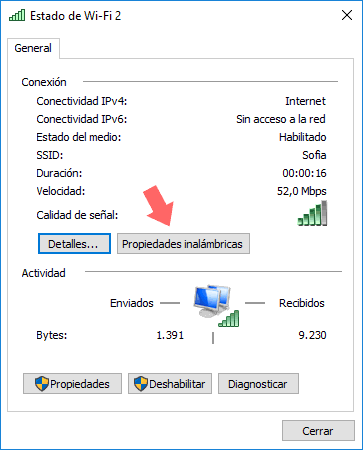 En el caso de que la conectividad sea inalámbrica, Wi-Fi, al pulsar en el campo "Conexión" veremos lo siguiente: Allí contamos con un botón llamado "Propiedades inalámbricas"