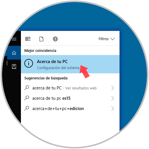 Para acceder a las propiedades usando este método, vamos al cuadro de búsqueda de Windows 10 e ingresaremos “acerca de tu PC”: