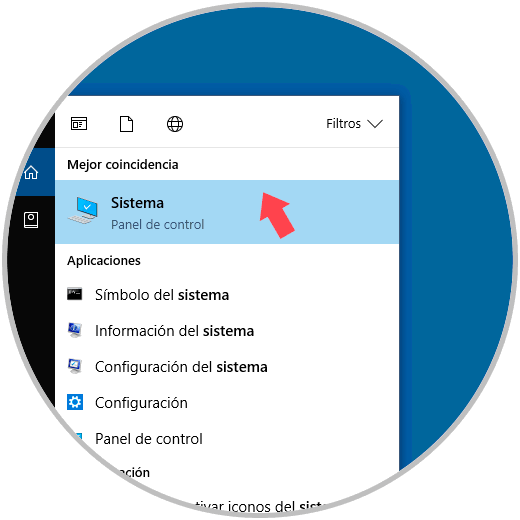 Al usar este método basta con ingresar el término “sistema” en el cuadro de búsqueda de Windows 10 y allí seleccionar la opción “Sistema”: