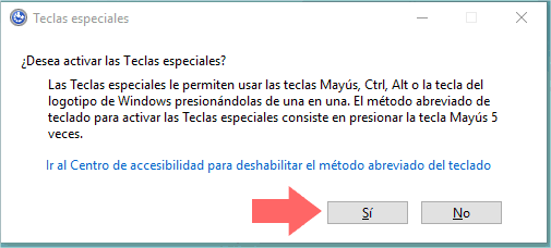 Para usar este método pulsaremos la tecla Shift (Mayúscula) en 5 ocasiones y será desplegado lo siguiente. Allí pulsamos en el botón Si para activar las teclas especiales en el sistema.