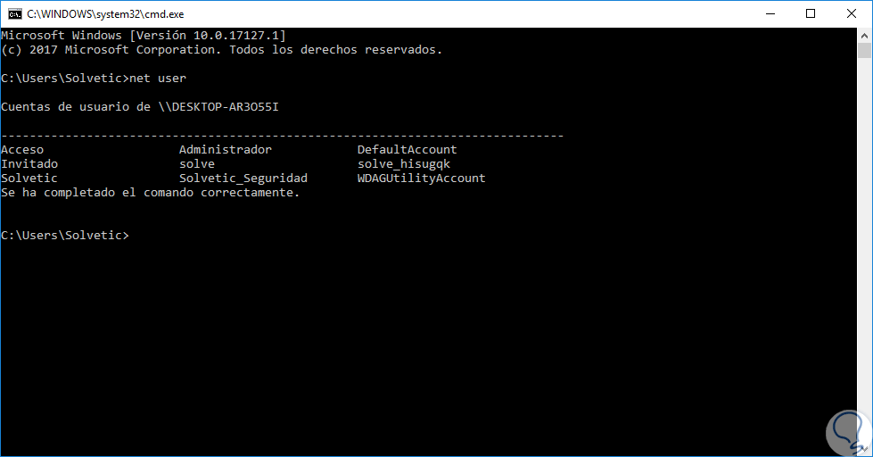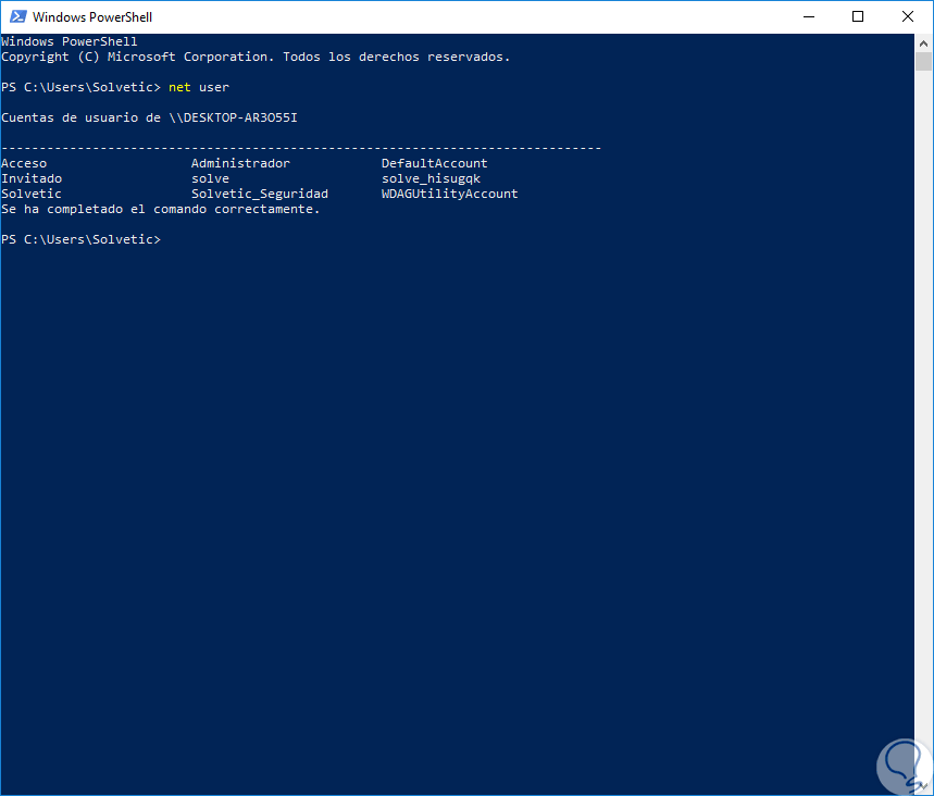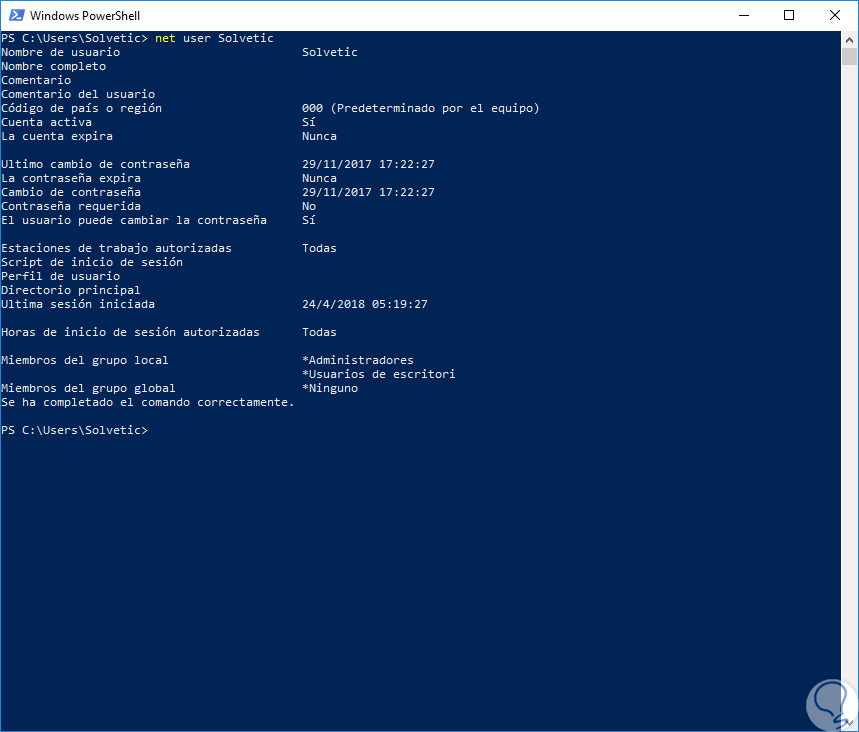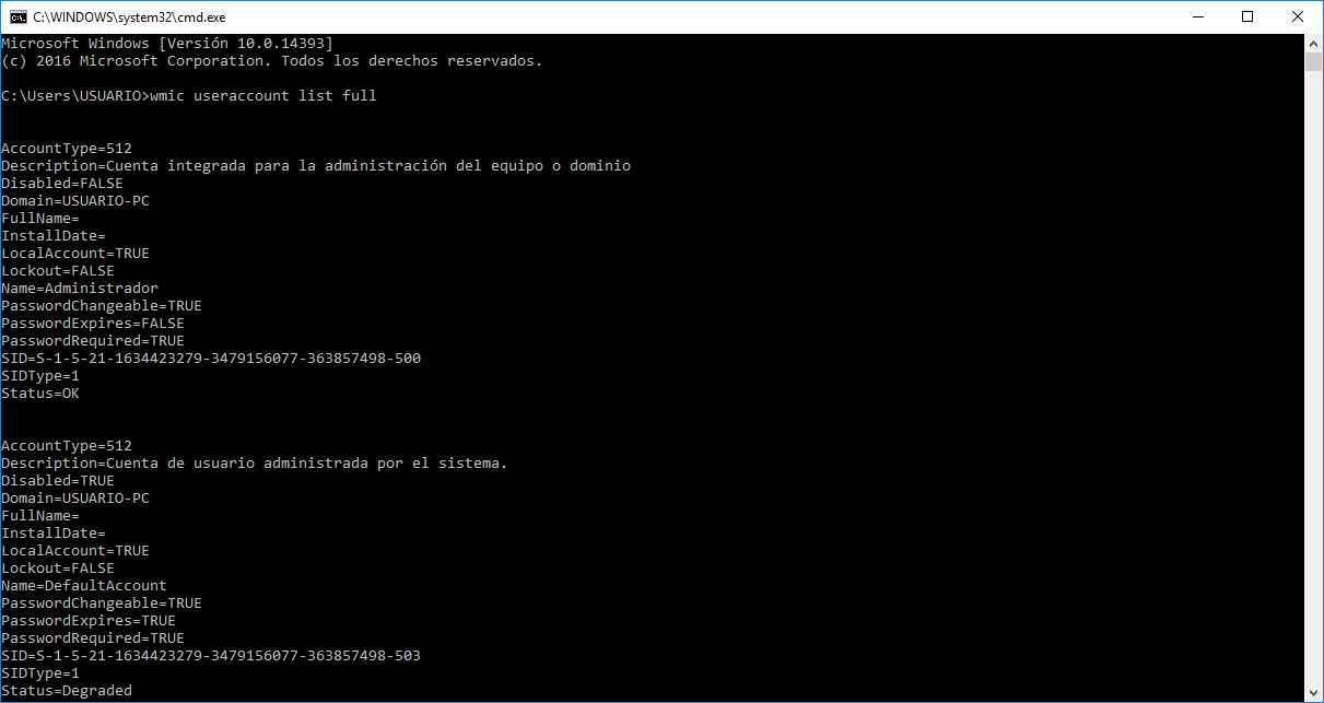 A continuación utilizaremos el siguiente comando para poder ver usuarios Windows 10 con todos sus detalles: