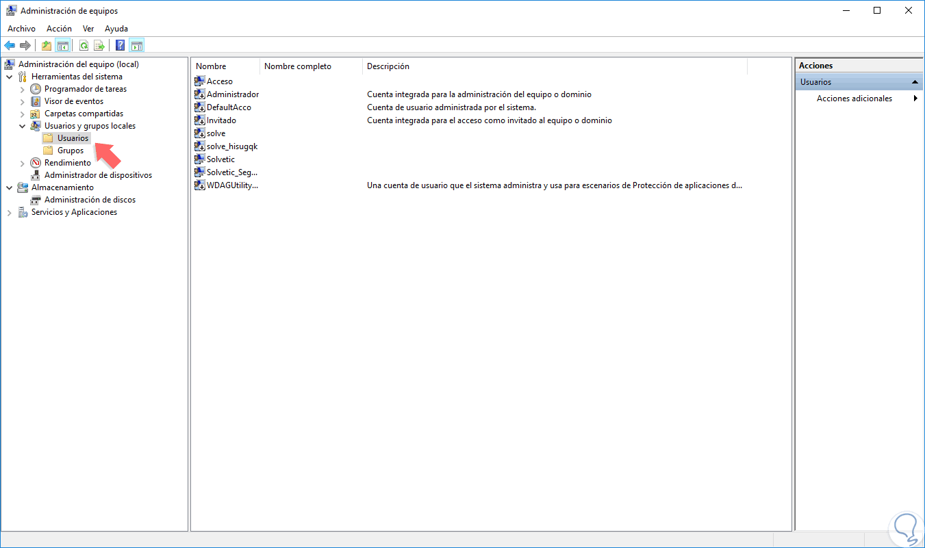 En la ventana desplegada, iremos a la sección “Usuarios y grupos locales” y en las opciones internas damos clic en la carpeta “Usuarios” y en el panel lateral podremos ver los usuarios actuales de Windows: