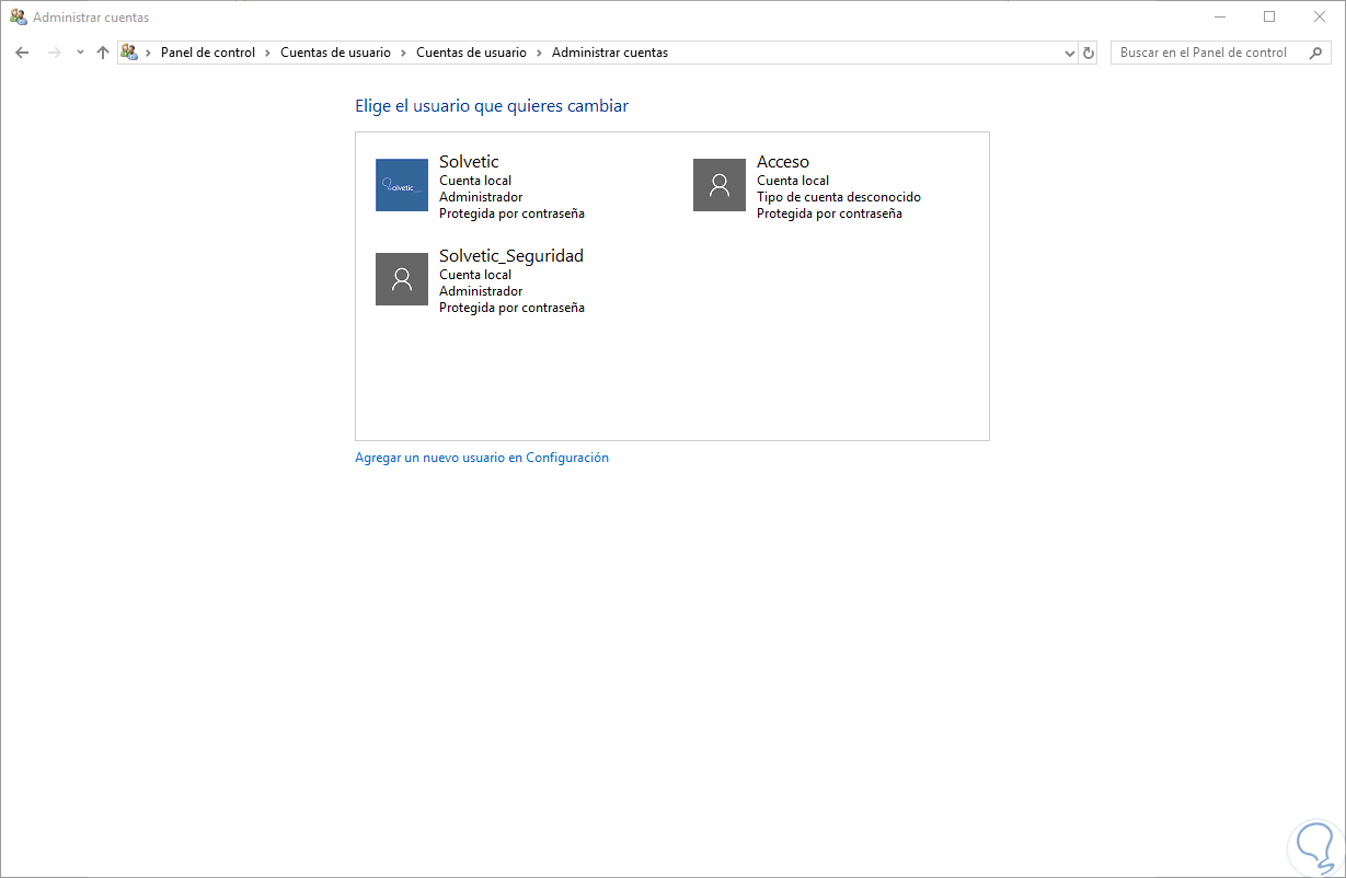 Damos clic en la sección “Cuentas de usuario” y veremos lo siguiente: