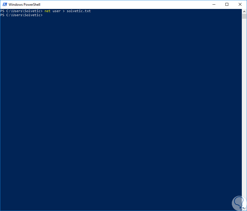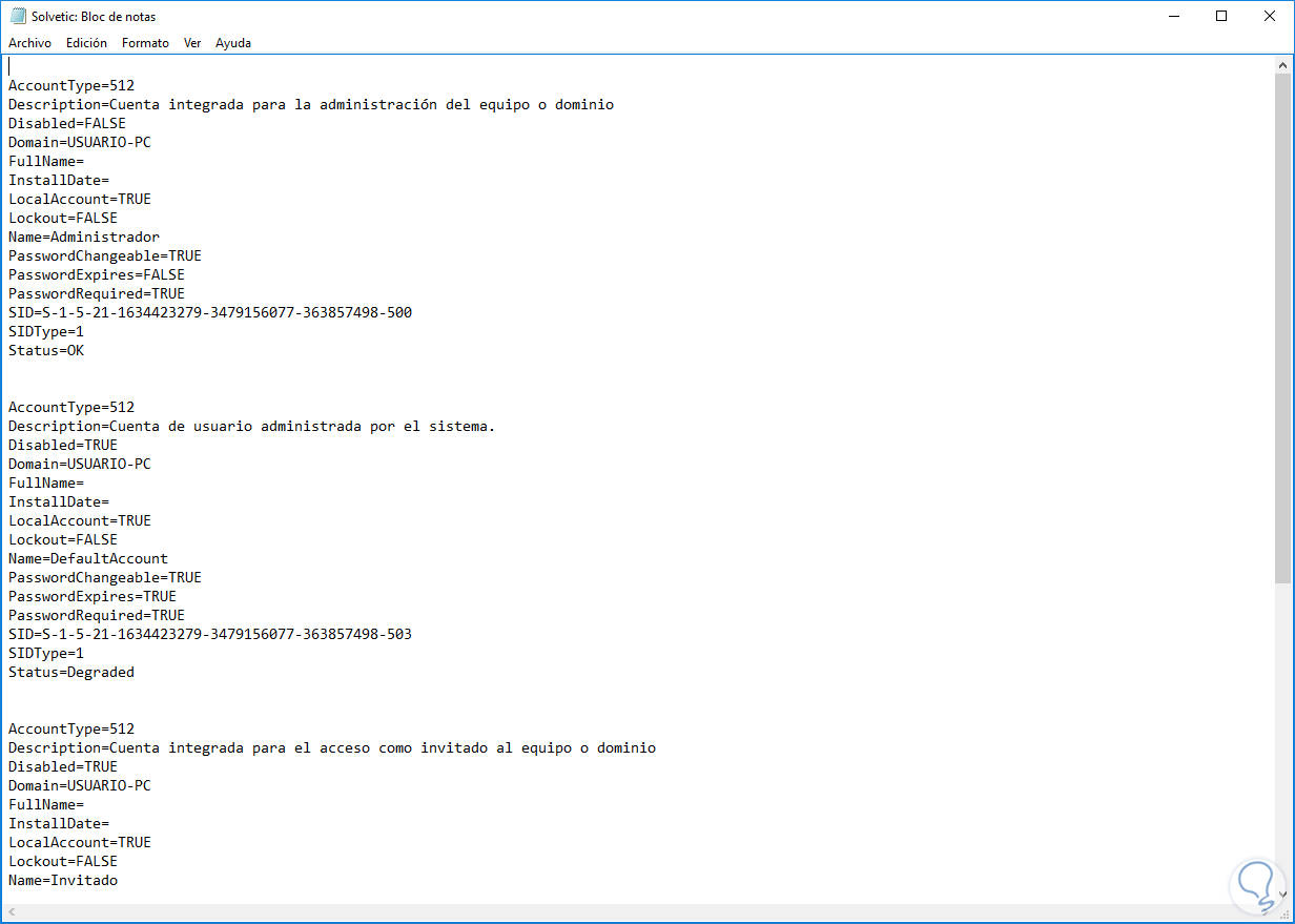 wmic useraccount list full >"%userprofile%\Desktop\Solvetic.txt"
