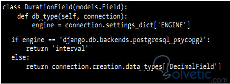En el ejemplo al definir un tipo de campo DurationField sobrescribimos el método get_prep_value() de forma que tome el objeto fecha y lo transforme en valores decimales para poder utilizarlo en base de datos sin mayor complicación.