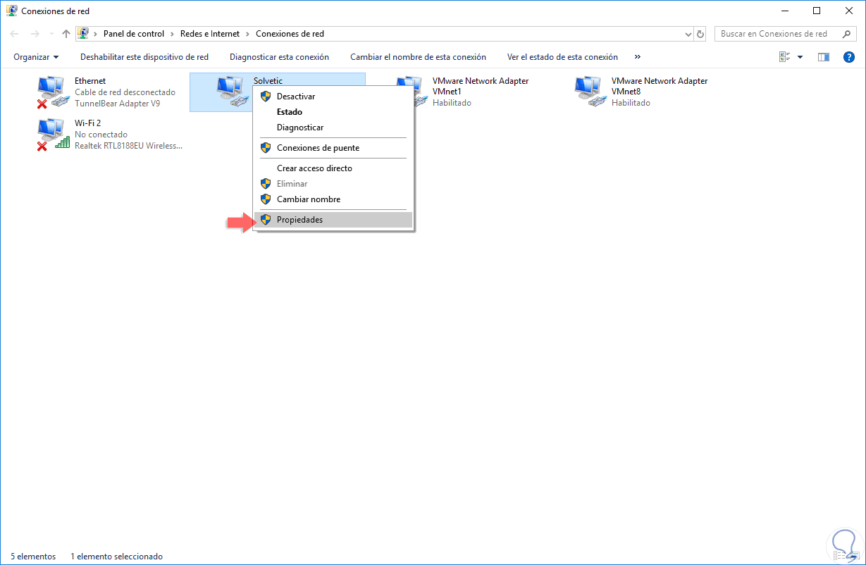 Allí daremos clic en la línea “Cambiar configuración del adaptador” ubicado en el costado izquierdo y en la nueva ventana daremos clic derecho sobre el adaptador actual y seleccionaremos la opción “Propiedades”.