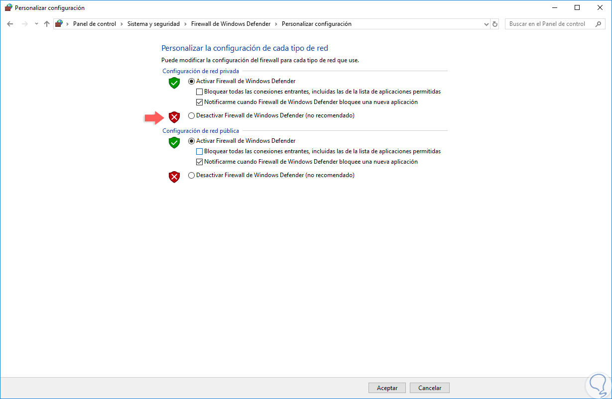 Allí activamos la casilla “Desactivar Firewall de Windows Defender” y realizar las respectivas validaciones.