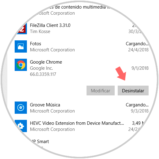 - Allí, en la sección “Aplicaciones y características”, ubicamos Google Chrome y al pulsar sobre ella damos clic en el botón “Desinstalar”: