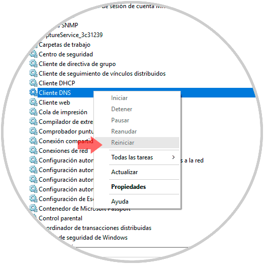 Dentro de los distintos servicios de Windows, encontramos uno especial para el cliente DNS el cual se encarga de gestionar estas tareas de conversión y con su reinicio podremos corregir el error, esto se debe a que al reiniciar el servicio refrescaremos su estado.