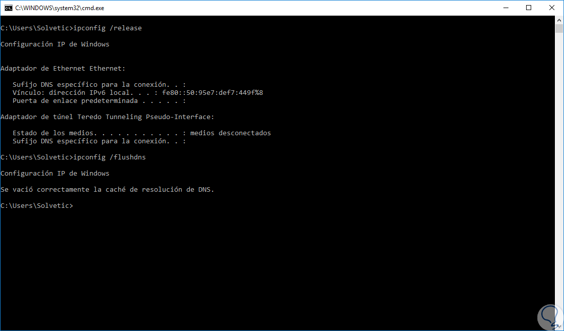 Esta opción involucra una serie de comandos que nos permite realizar tareas como liberación y renovación de la dirección IP y demás.