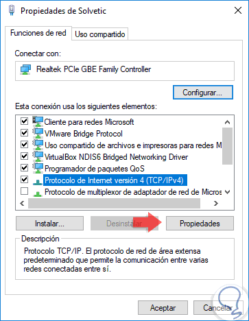 En la nueva ventana seleccionaremos la línea “Protocolo de Internet versión 4” y pulsamos en el botón