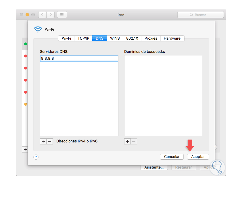 Para agregar los nuevos DNS basta con pulsar en el signo + ubicado en la parte inferior y allí añadir las respectivas direcciones IP. Pulsamos en Aceptar para aplicar los cambios.